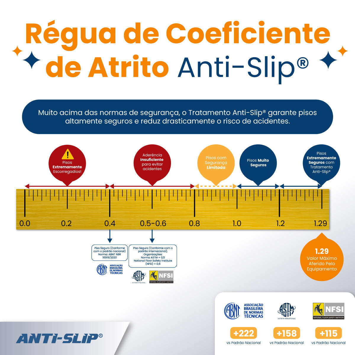 Embora as normas ofereçam um guia para segurança, elas não garantem total eficácia em condições com água, sabão e gordura. O tratamento Anti-Slip® eleva o coeficiente de atrito para valores entre 1,20 e 1,29, proporcionando segurança máxima em todas as condições.